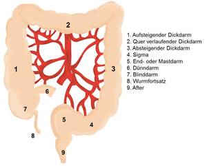 Der ca. 1,5 m lange Dickdarm ist eingeteilt in den Blinddarm mit Wurmfortsatz, dem aufsteigenden Darm, dem Querdarm, dem absteigenden Darm und dem S-Darm (Sigma). Er endet in dem End- oder Mastdarm, wie nebenstehende Abbildung veranschaulicht: